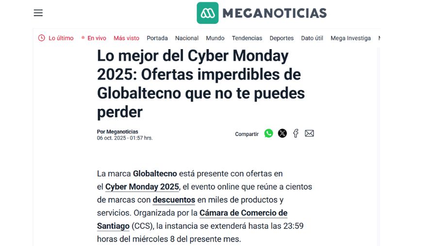 A continuación, puedes revisar las principales ofertas que Globaltecno tendrá a lo largo del Cyber Monday 2025 en este link.”